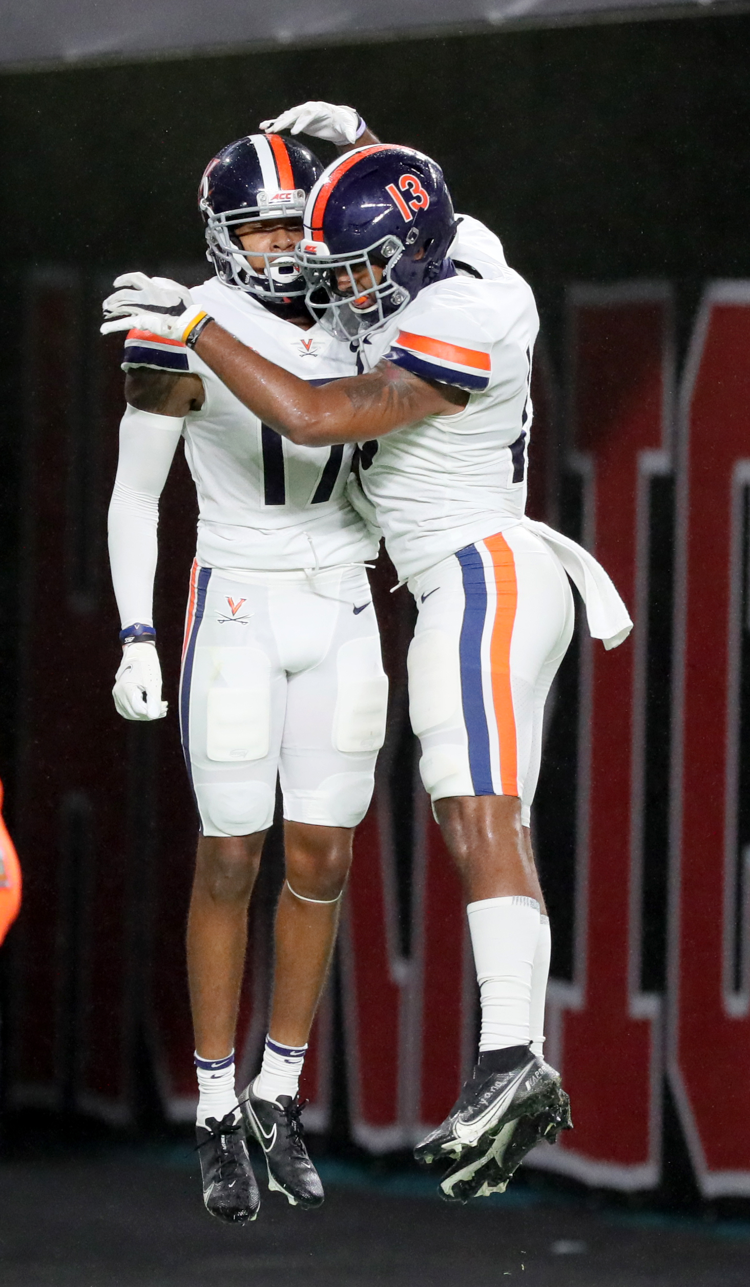 Virginia’s Ra’Shaun Henry (17) and Terrell Jana (13) celebrate the apparent 24-yard touchdown in the second quarter that was taken off the board.