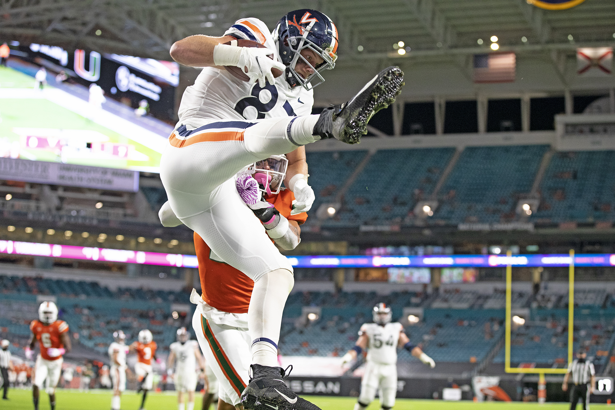 Virginia tight end Tony Poljan catches a first-quarter touchdown as Miami’s Bubba Bolden fails to defend (Photos: ACC Media Services).