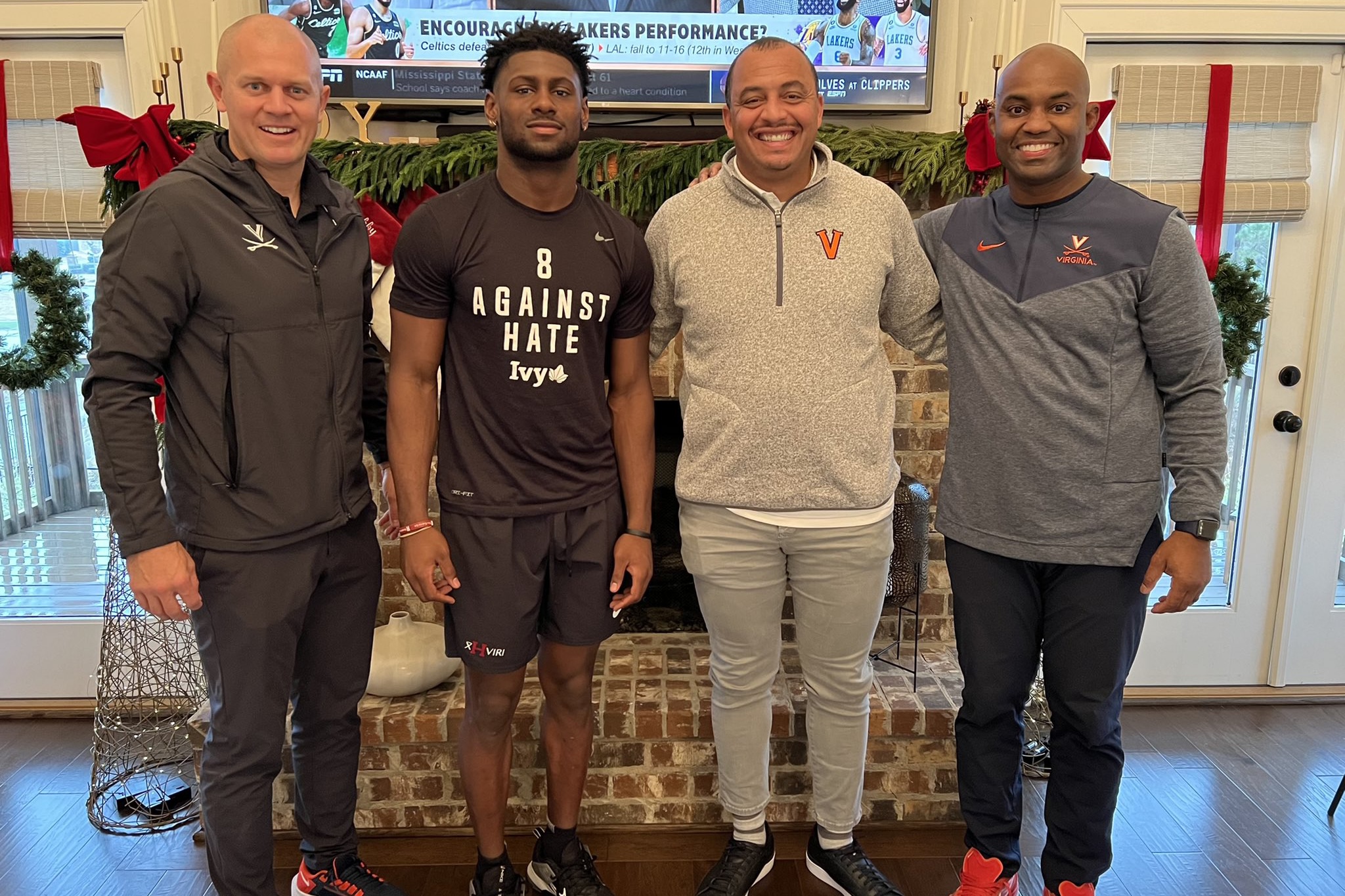From left: UVA defensive coordinator John Rudzinski, Alex Washington, head coach Tony Elliott and defensive backs coach Curome Cox. (Photo: twitter.com/Alex_w04)