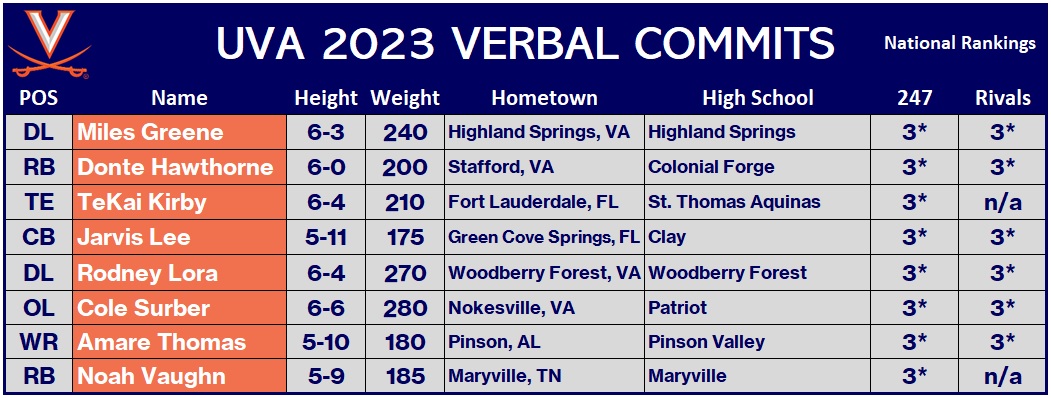 He is the eighth commit to UVA’s recruiting class of 2023 and the second running back, joining Donte Hawthorne (6-0, 200) of Stafford. All eight of the Cavaliers’ eight commitments thus far are rated 3-stars by the national recruiting services.