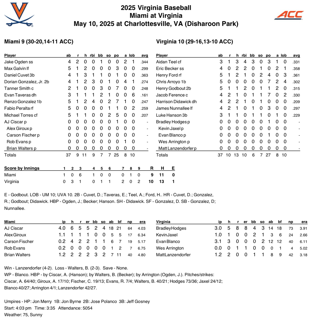 The series concludes on Sunday with the final game of the three-game set. Virginia will have lefthander Tomas Valincius (4-1) on the mound against Miami righthander Tate DeRias (2-0). First pitch is slated for 1 p.m. and will air on ACCNX and WINA (98.9 FM/1070 AM).