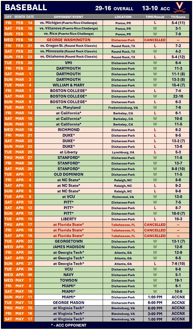 - UVA improves to 27-4 on the season when scoring six or more runs.