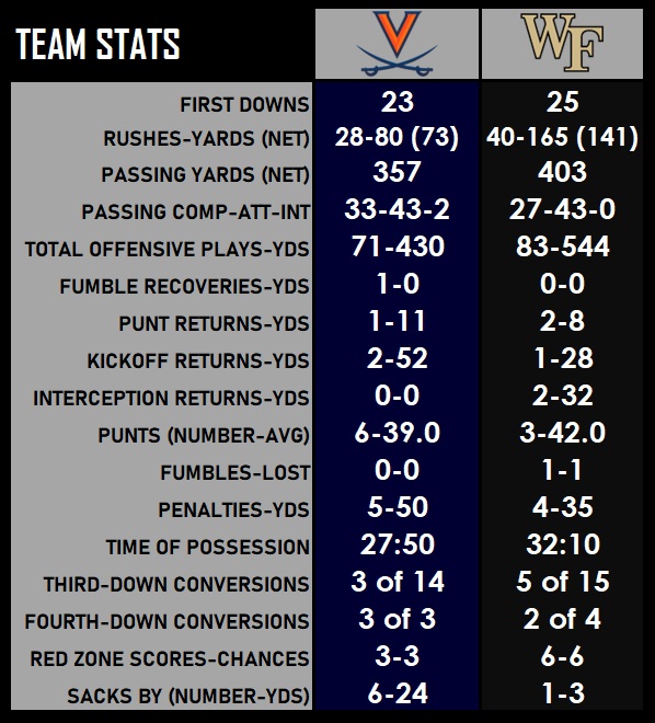 Wake (1-1, 0-1) marched it down inside the Virginia 40-yard line on its ensuing drive, but was faced with a crucial fourth-and-9 and the Hoos defense delivered.