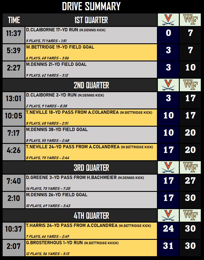 Wake put together a 14-play, 75-yard scoring drive out of the locker room that took 7:20 off the clock and pushed the lead back to double digits, 27-17, on a 3-yard toss from Bachmeier to Greene, and Matthew Dennis tacked on a 26-yard field goal to make it 30-17 with 2:10 left in the third quarter, after the Deacs came up short on a third-down conversion inside the UVA 10-yard line.