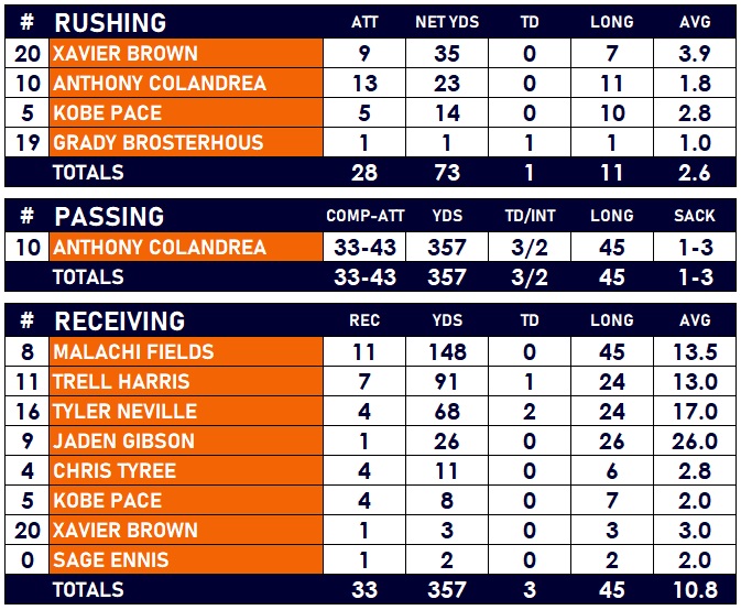 Colandrea threw for 357 yards and 3 touchdowns (2 interceptions), completing 33 of his 43 attempts while carrying the ball 13 times for 23 yards. Fields had another monster night, going for a team-high 148 yards on just 11 catches, while Harris added 7 grabs for 91 yards and a score and Neville reeled in 4 balls for 68 yards and his two end-zone trips.