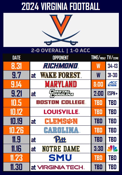 The Cavaliers return to Scott Stadium next Saturday to host former ACC rival Maryland at 8 p.m. on ACC Network.