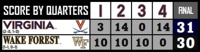 - Virginia collected its first win in Winston-Salem since 2002, when it scored the final three touchdowns to erase a 17-point deficit and win, 38-34.