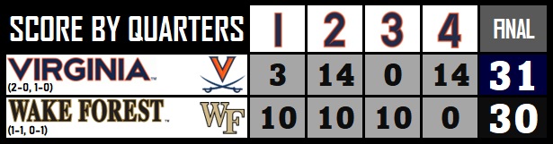 Wake (1-1, 0-1) marched it down inside the Virginia 40-yard line on its ensuing drive, but was faced with a crucial fourth-and-9 and the Hoos defense delivered.