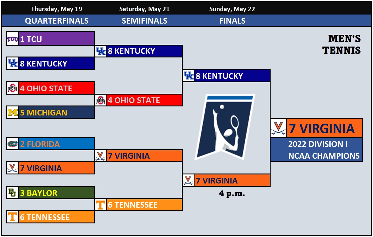 The Cavaliers entered the tournament as the No. 7 seed and rolled past No. 2 Florida, 4-1, on Thursday in the quarterfinals, then knocked off No. 6 Tennessee, 5-0, on Saturday.