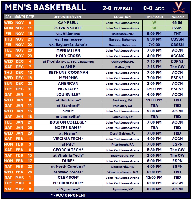 • Virginia is 248-56 (.816), including a 2-0 mark in 2024-25, in 19 seasons at John Paul Jones Arena