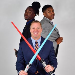 Bryce Perkins, Bronco Mendenhall and Bryce Hall having a little fun down at ACC Kickoff in Charlotte in July (Photo: The ACC).