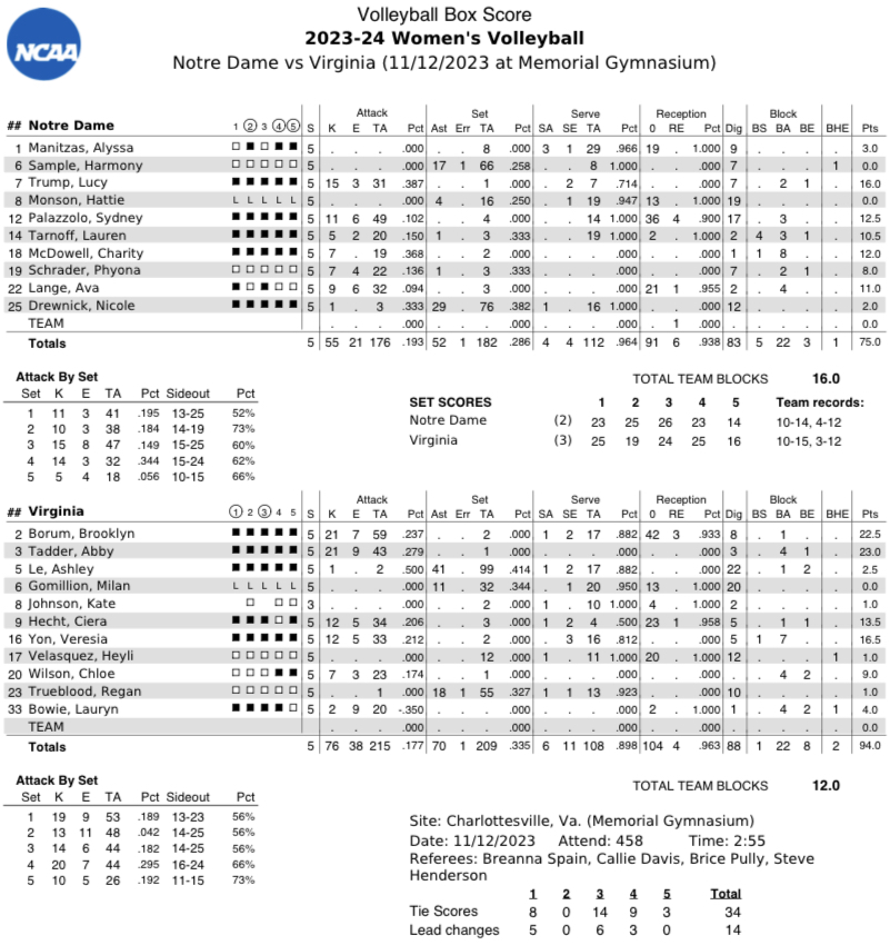 Neither of the two sides were able to break away from the other in the fourth period, as the Hoos and Fighting Irish traded blows back and forth throughout. UVA knotted the game up after claiming five of the final seven points. Le assisted 16 of Virginia’s 20 kills in the fourth period.