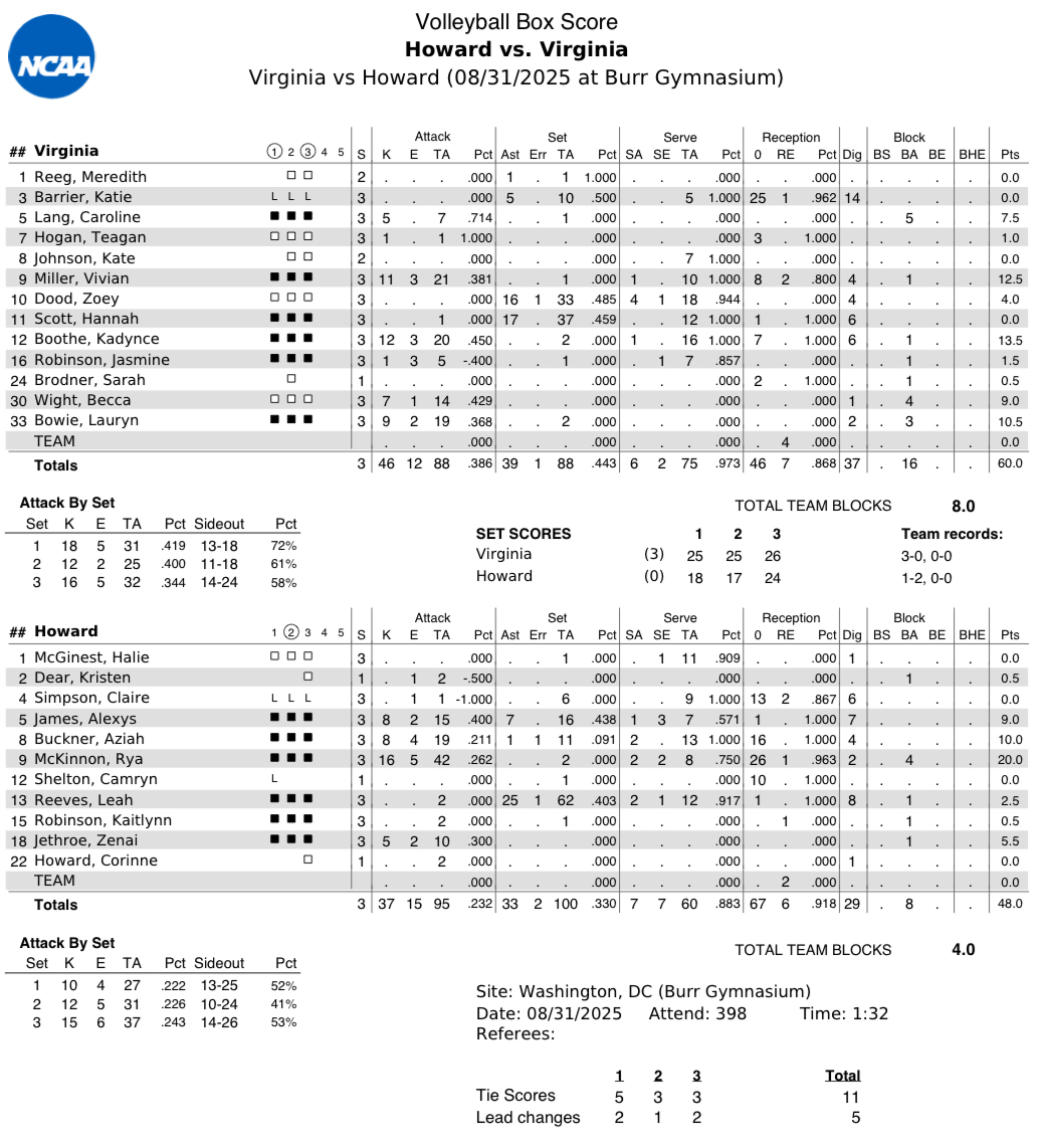 - Virginia outhit Howard, .386 to .232, in the three-set victory.