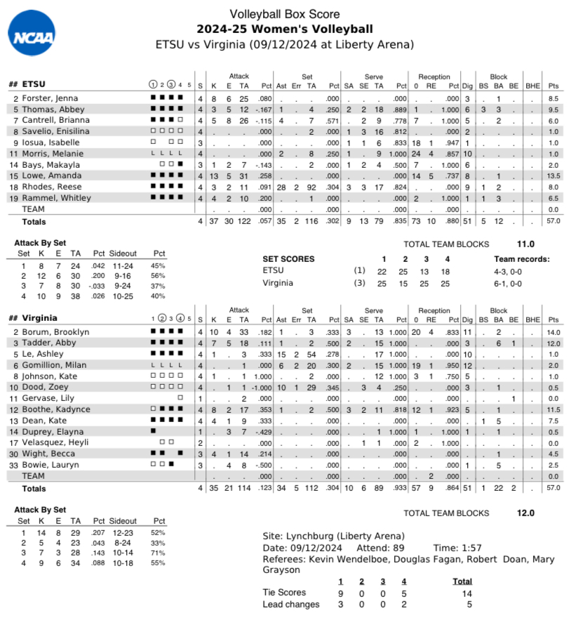 Virginia (6-1) led by as many as five points [17-12] in the first, but ETSU later fired off six straight points to take a 21-19 lead. The Cavaliers closed out the set by scoring six of the last seven points, five of which were kills.