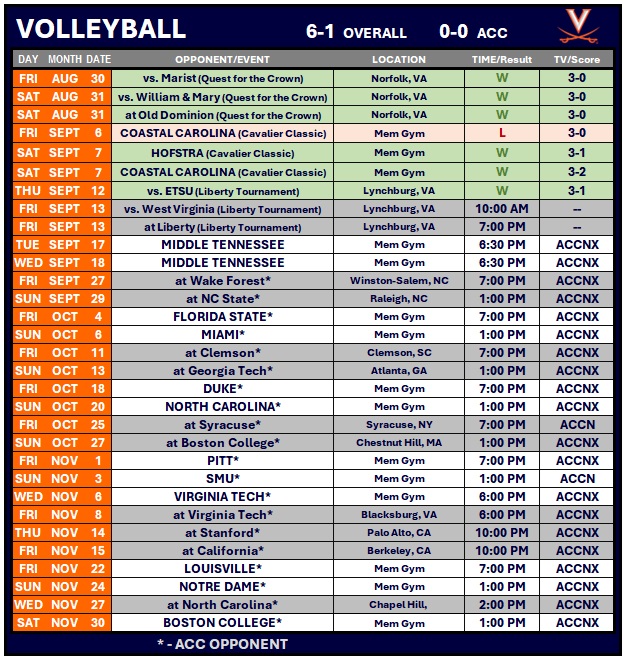 - For the 10th time in program history and second under head coach Shannon Wells, UVA is off to a 6-1 start.