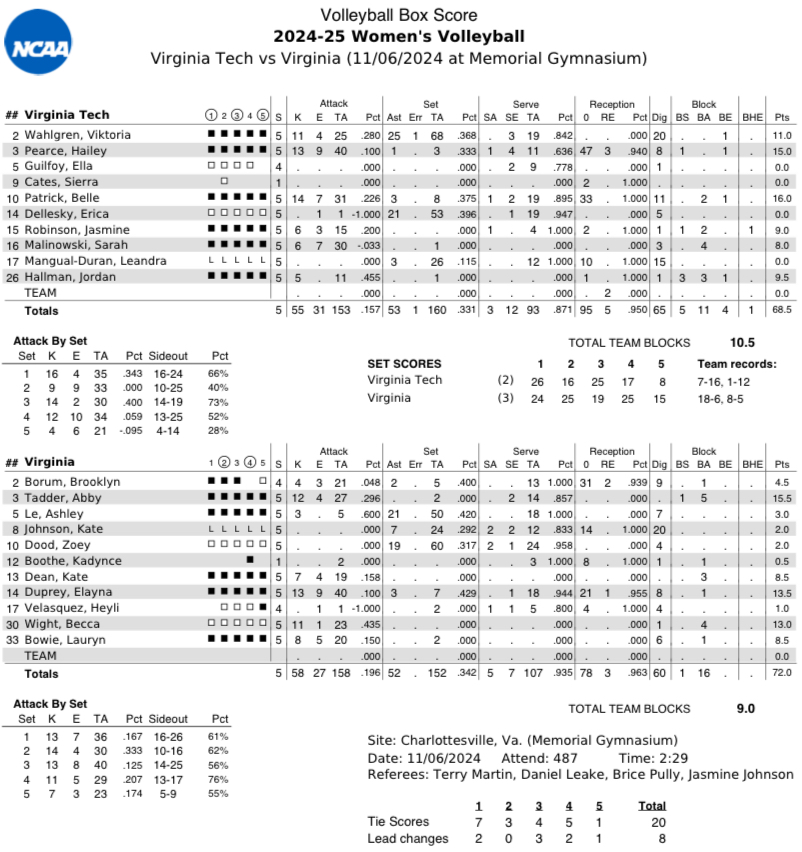 The Hokies came out fast in each set, making it very difficult for the Cavaliers throughout. Both teams traded sets, with Tech winning the first and third sets and UVA winning the second and fourth sets.