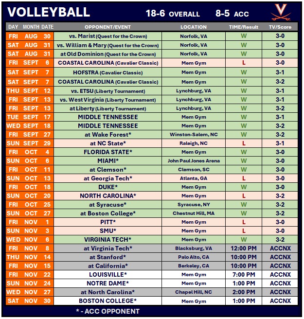 • Virginia now leads the all-time series with Virginia Tech 42-40 and is riding a five-match win streak over the Hokies.