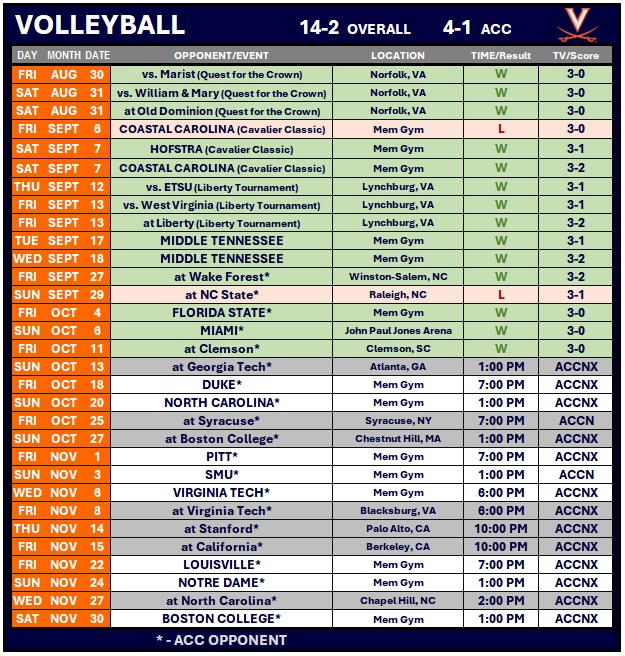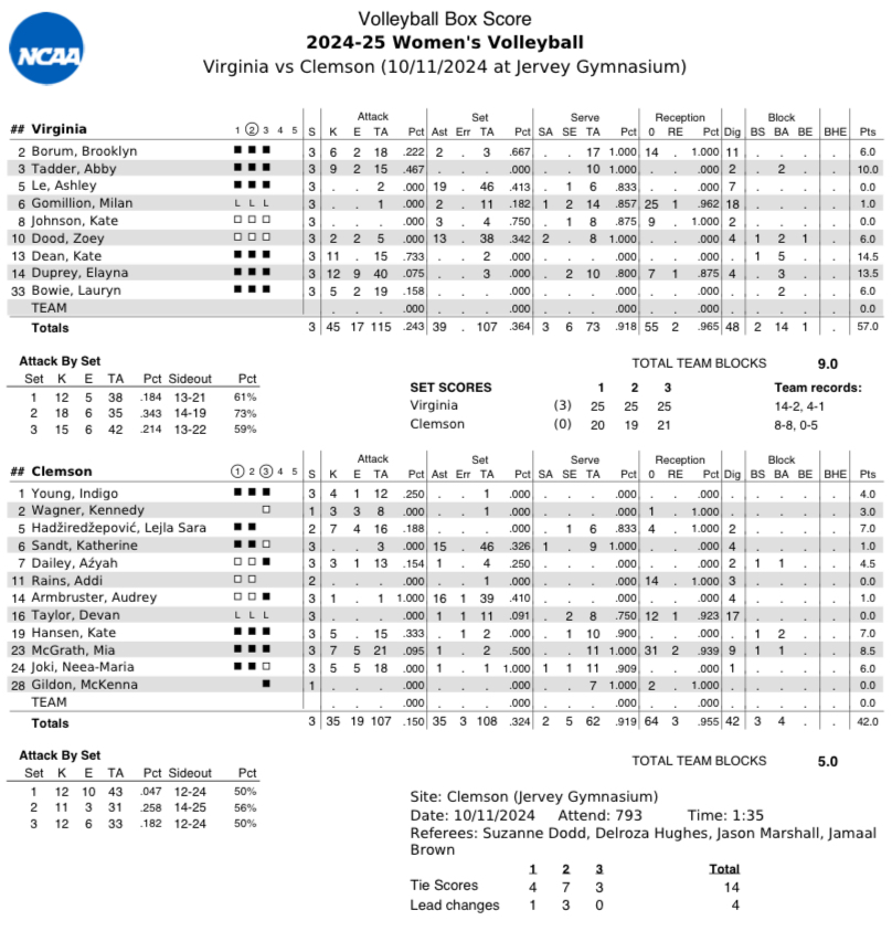 - UVA’s 45 kills against the Tigers matched the Cavaliers’ 45 kills against Miami (Oct. 6) for the most in a sweep over an ACC opponent since recording 46 at home against Virginia Tech in 2022.