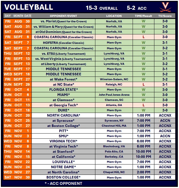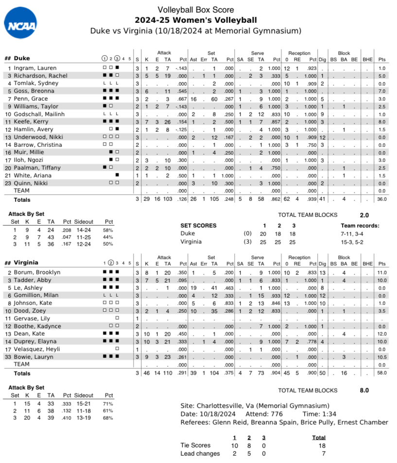 Coming off a road loss at Georgia Tech on Sunday, Virginia had an outstanding bounce-back match, winning all three sets (25-20, 25-18, 25-18) on Friday Night against Duke at Memorial Gymnasium. The Cavaliers led in all categories allowing them to pull out the decisive win.