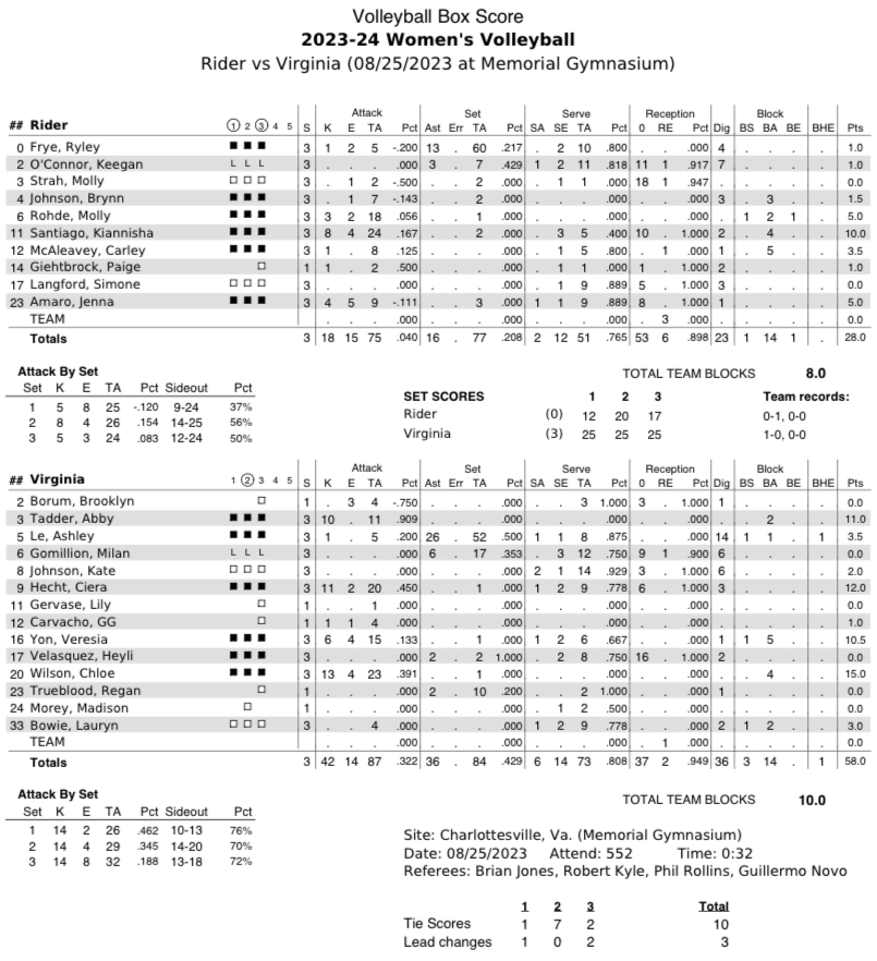 Virginia opened its 45th season on Friday night with a convincing sweep over Rider (25-12, 25-20, 25-17). The Cavaliers were led by right side hitter Chloe Wilson (13 kills, 4 blocks), newcomer Ciera Hecht (11 kills) and Tadder (10 kills, 11 attempts).