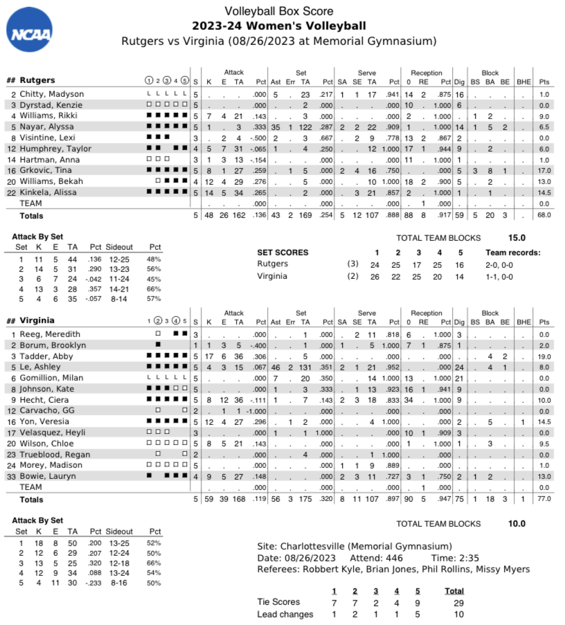 SET 1: Virginia 26, Rutgers 24