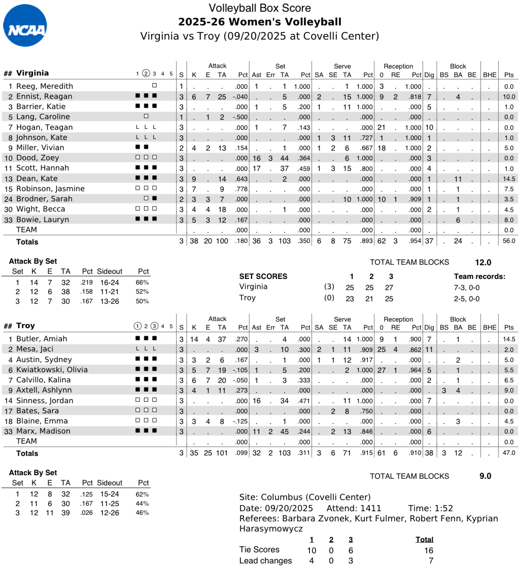 Troy opened the third and final set of the game with a pair of points before Virginia strung together a 7-0 run that was spearheaded by a quartet of block assists from Dean. Following Troy notching the set at 16-16, UVA jumped back out in front with three-straight points to take a 19-16 lead, forcing a Trojan timeout. In the later stages, Troy battled back to pull ahead at 25-24 before the Cavaliers collected the final three points to secure the sweep.