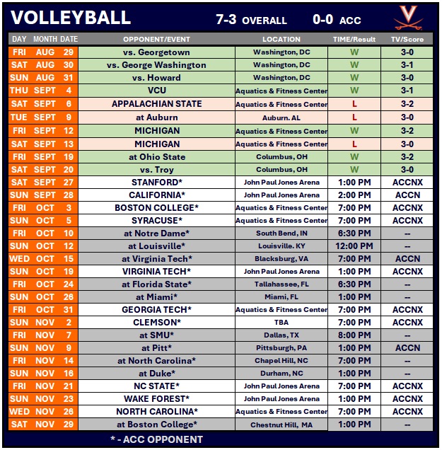 Virginia will return home to host Stanford and Cal for the opening weekend of ACC play. Both matches will be played at John Paul Jones Arena and tickets can be purchased at UVATix.com.