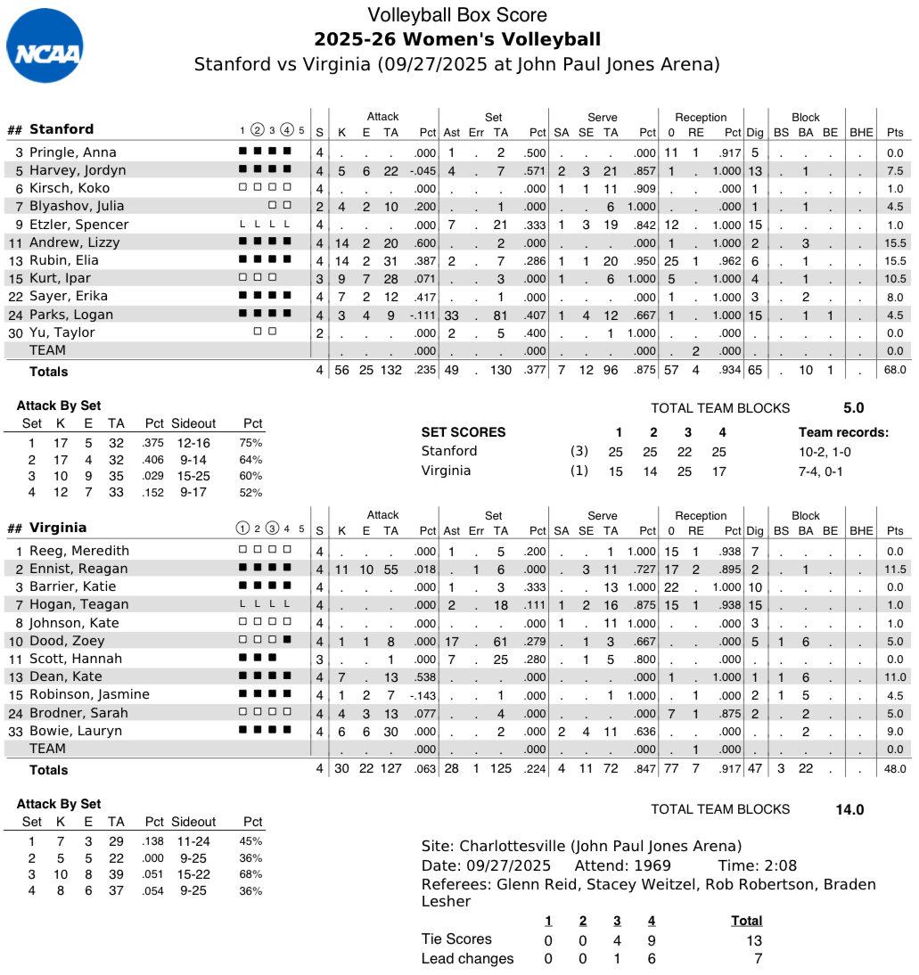 The fourth and final set of the match proved to be the most competitive, with nine ties and six total lead changes. Stanford and Virginia jousted to a 13-13 tie before the Cardinal took control of the game with a 10-1 run. A late Teagan Hogan service ace made it a 23-16 contest prior to Stanford scoring two of the final three points of the day.