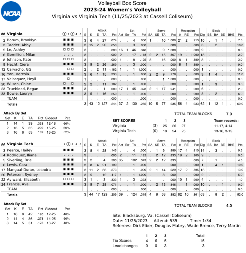 - Virginia had a 7.0-4.0 advantage in blocks over Virginia Tech.