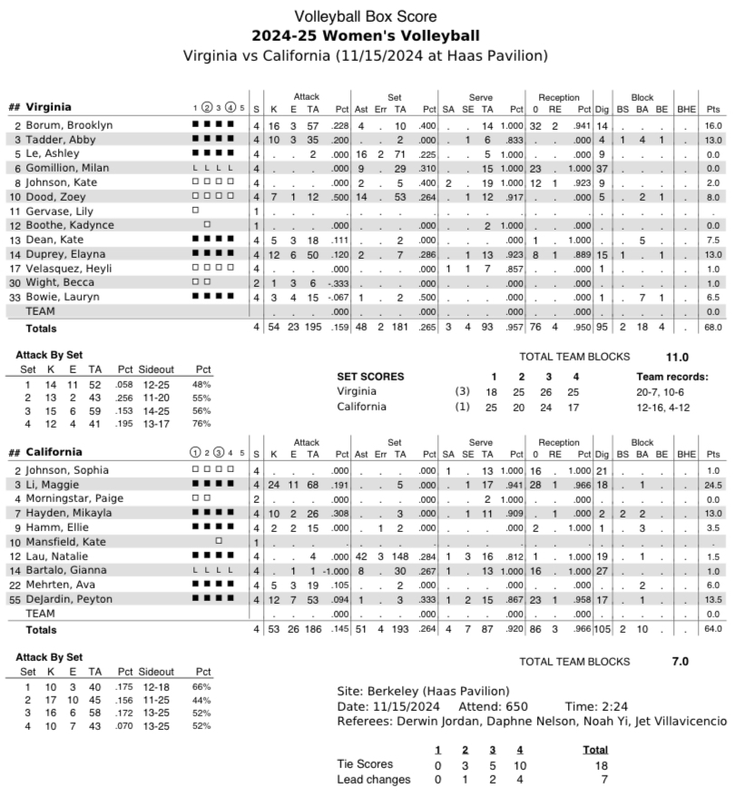 The fourth set saw a match-high 10 ties and four lead changes. After playing to a 12-12 tie, Virginia took control of the set with a 9-2 run highlighted by a Heyli Velasquez ace at 21-14. One final comeback Cal comeback was thwarted when Borum sealed the victory with her 16th kill of the night.