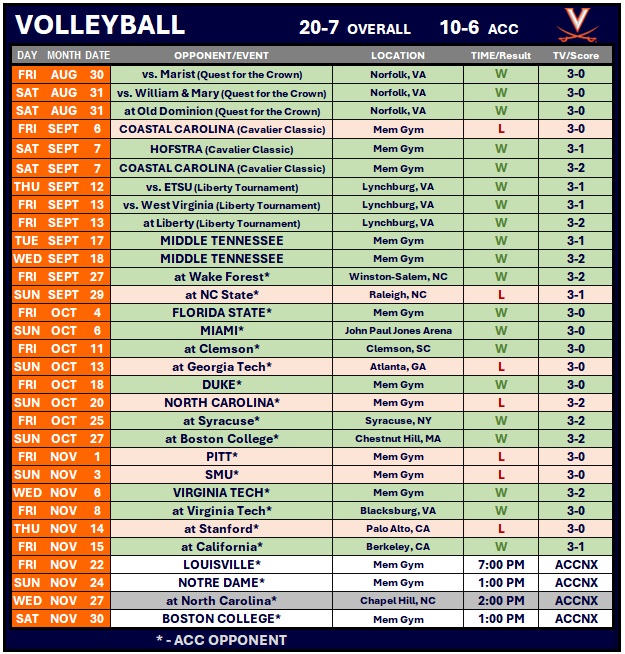 The Cavaliers return to Memorial Gymnasium on Friday (Nov.22) to host No. 3 Louisville before welcoming Notre Dame on Sunday (Nov. 24).