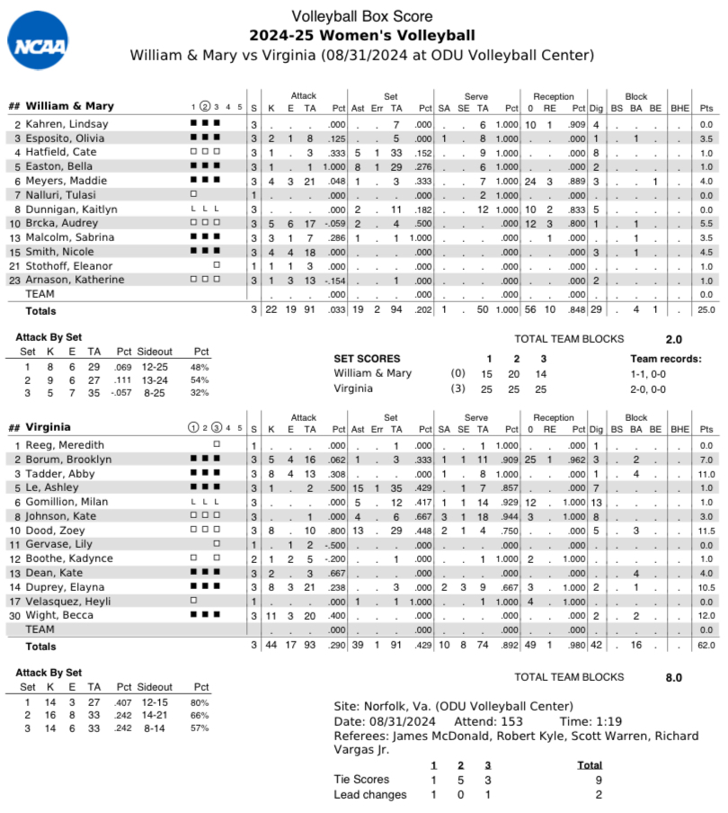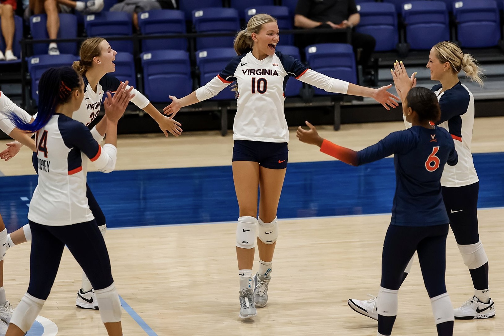 Virginia defeated William & Mary 3-0 (25-15, 25-20, 25-14) in an afternoon match before topping host school Old Dominion 3-0 (26-24, 26-24, 25-19) that evening.