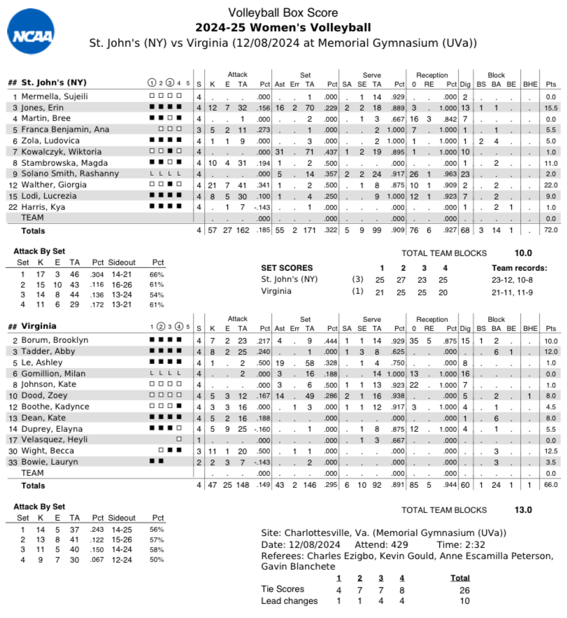 Virginia hosted a postseason matchup for the first time in 25 years on Sunday, but visiting St. John’s held on for an upset win in four sets at Memorial Gymnasium.