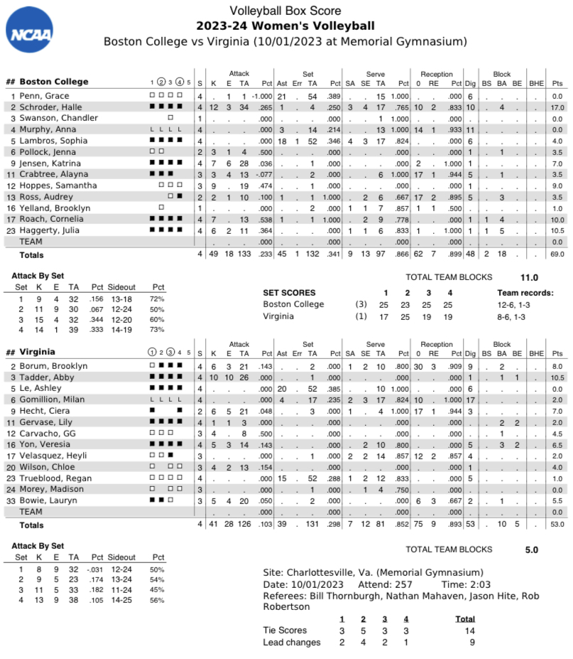 The Cavaliers fell in a hole early in the final set of the match, trailing the Eagles 4-9 but managed to pull their way back to tie things up 13-13. Virginia brought the final set within two points [18-20], though Boston College outscored the Hoos 5-1 down the stretch to seal the victory. Chloe Wilson finished the closing set with three kills on seven attempts (.429).