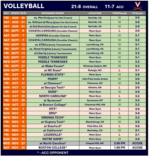 The Cavaliers (21-8, 11-7 ACC) played a great match overall, as several teammates contributed in key situations. Lauryn Bowie and Becca Wight got some meaningful points and made a contribution with their opportunity.