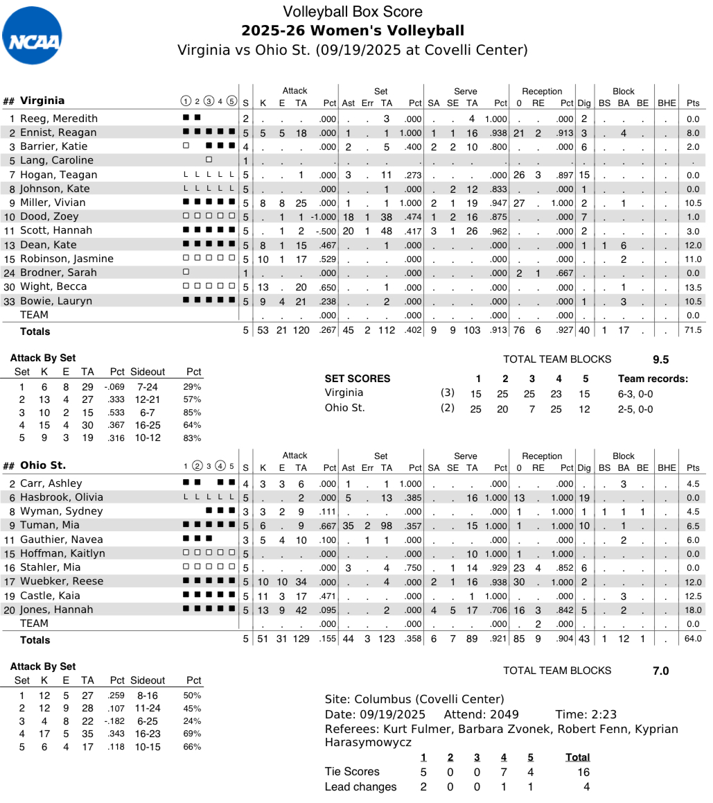 Set 5: Virginia 15, Ohio State 12