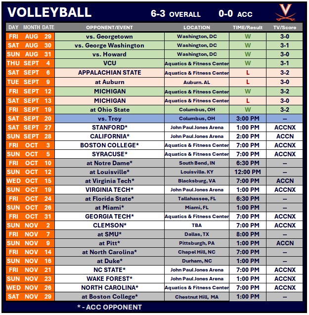 Becca Wight, a native of Worthington, Ohio, led the Cavalier attack with 13 kills to match Ohio State’s Hannah Jones for the match high. Wight’s 13 kills came on 20 attempts for a .650 hitting percentage. To go along with Wight’s 13 kills, Jasmine Robinson had 10 of her own and hit .529 in the victory.