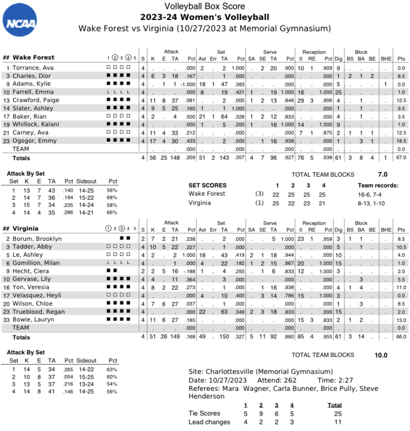 The Cavaliers and Demon Deacons (16-6, 7-4) traded short bursts of scoring throughout the entirety of the final period, with neither team being able to pull away. The Hoos came within one point [21-20] before Wake went on to score four of the last five points. Virginia was outhit .286-.146 in set No. 4.