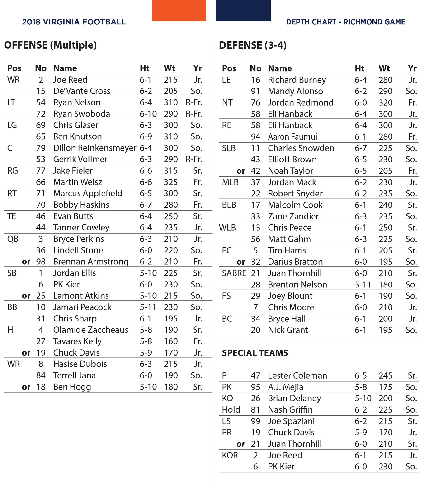 Meanwhile, Bryce Hall was listed ahead of Nick Grant at the border corner spot, and Tim Harris and Darius Bratton are presently a toss-up at the field corner position in what should be one of the ACC’s strongest secondaries.