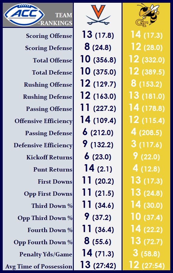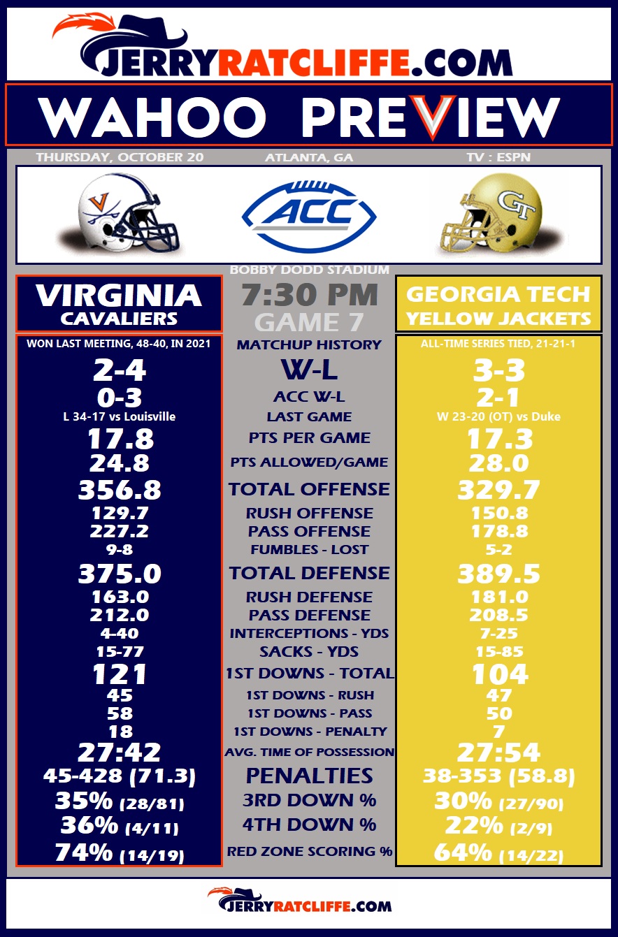 The Virginia football team faces ACC Coastal Division rival Georgia Tech Thursday night in Atlanta, with the Cavaliers still looking for their first conference victory of the season. UVA (2-4, 0-3 ACC) has dropped five league matchups in a row dating back to last season, but has had a bye week and an 11-day layoff to readjust and prepare for its next shot at a win on Thursday night in front of a national TV audience (7:30 p.m., ESPN).