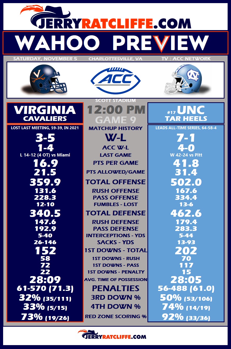 For more UVA-UNC game-week coverage, check out our Football archives here, and you can also listen to two separate versions of The Jerry Ratcliffe Show podcast previewing the contest — one with Andrew Jones, publisher of Tar Heel Illustrated, and one from the Virginia angle with co-host Chris Graham.
