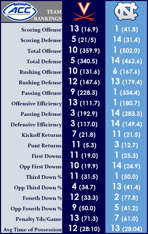 Carolina (7-1, 4-0 ACC) will be the first ranked opponent the Cavaliers (3-5, 1-4) have faced this season. The Tar Heels, 7-point favorites by the oddsmakers, are looking to go 5-0 on the road for the first time in 25 years. However, UNC coach Mack Brown has never won in Charlottesville (0-for-6) in two stints as coach of the Heels.