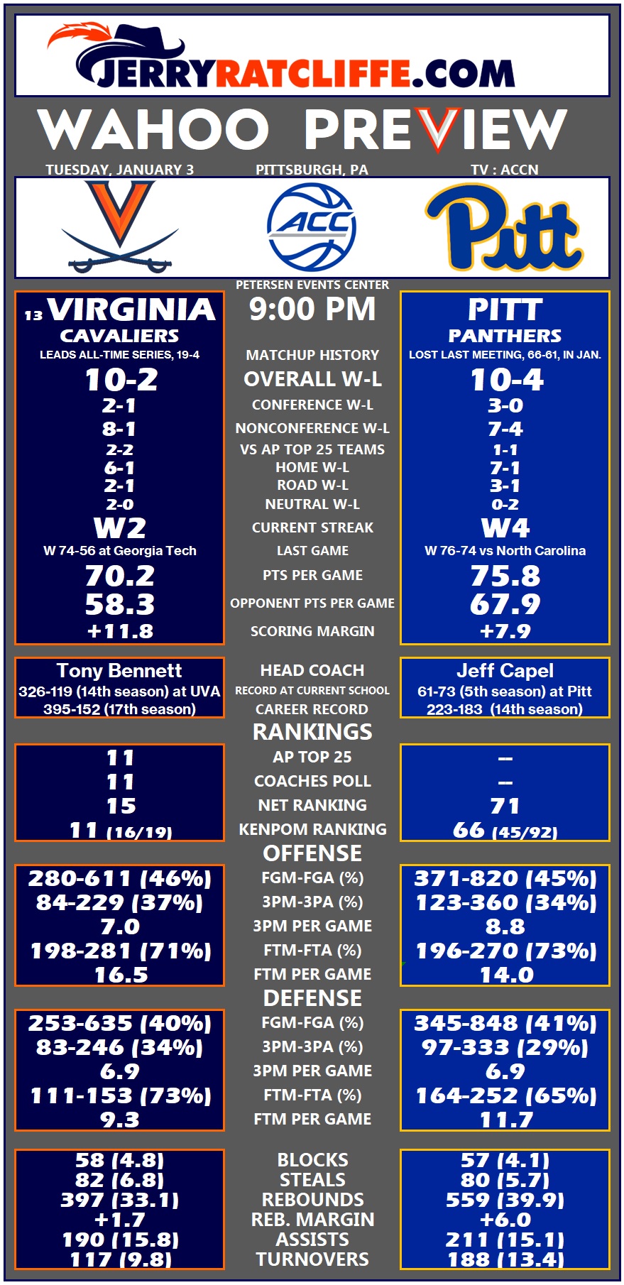 The Cavaliers’ signature Pack-Line defense will have its hands full with several capable weapons on the floor for the Panthers. Virginia is still the conference leader in scoring defense at 58.3 points allowed, but Pitt is averaging 83.3 over its past four outings.