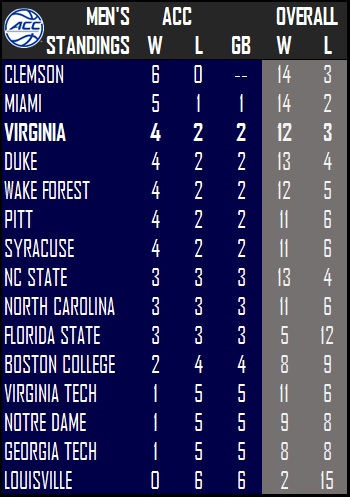 The Cavaliers (12-3, 4-2 ACC) have strung together two in a row, downing both Syracuse and North Carolina at John Paul Jones Arena last week.