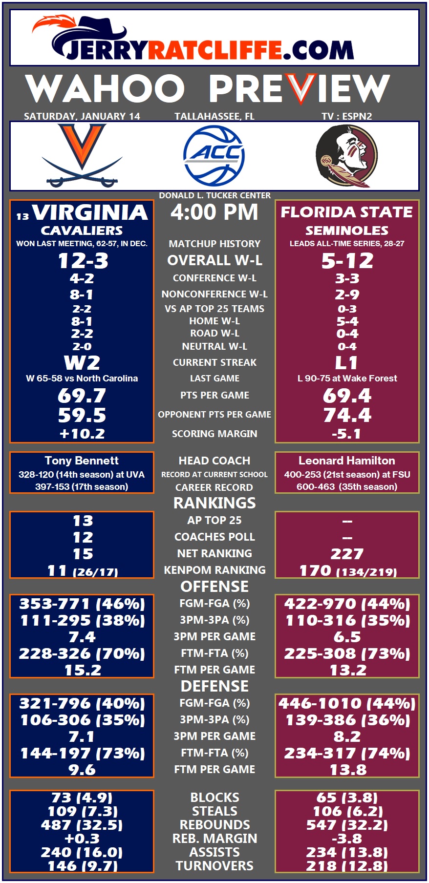 Darin Green Jr. (14.0 ppg) and Matthew Cleveland (14.7 ppg) both rank inside the top 20 on the ACC scoring list. The Seminoles have prevailed over the Wahoos in four of the last six meetings.