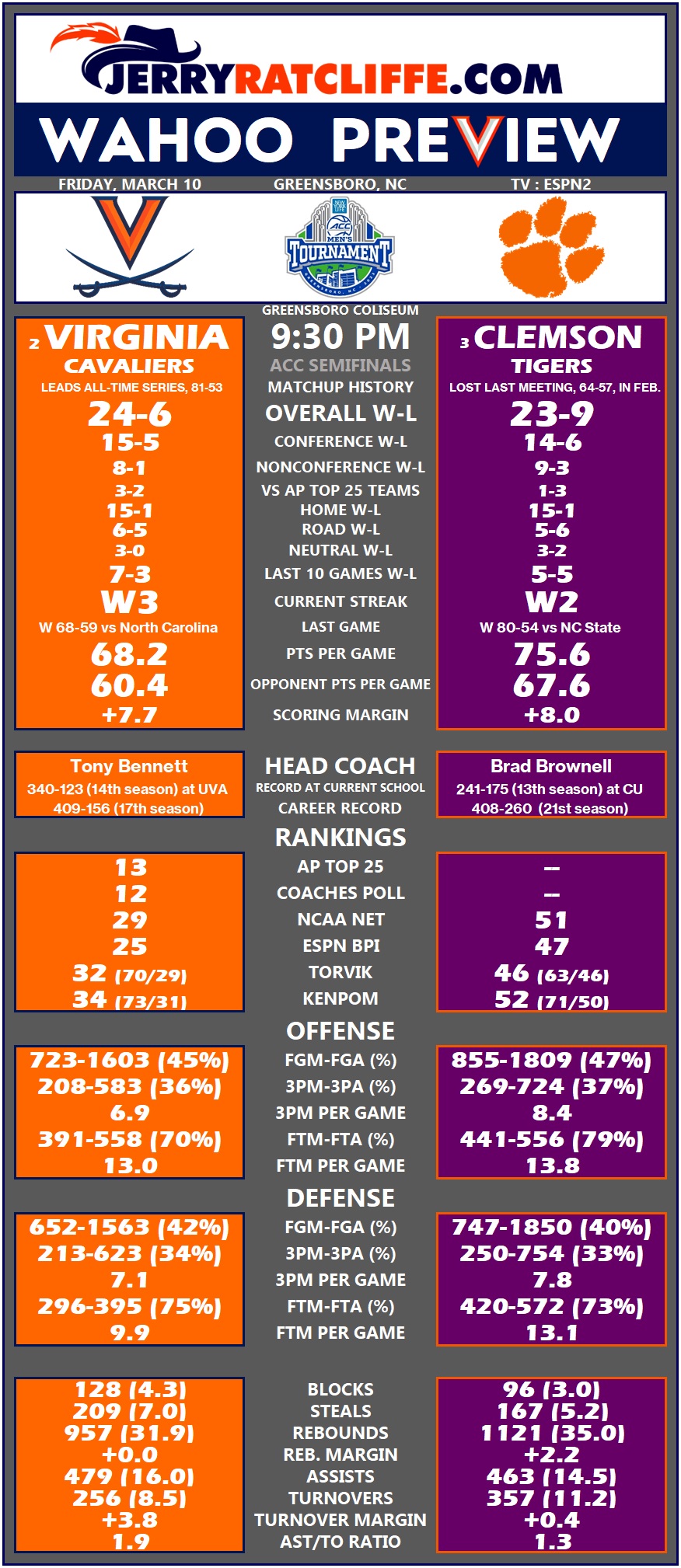 GREENSBORO, N.C. — Virginia is two victories away from claiming its fourth ACC Tournament title, with a meeting against Clemson in the semifinals next up tonight in Greensboro (9:30 p.m., ESPN2).