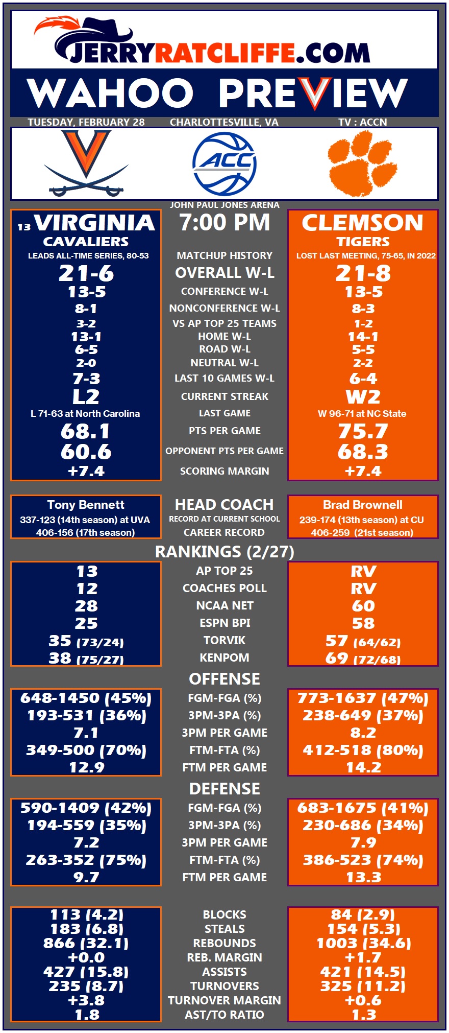 That being said, Virginia can still lock up a top-four seed and a double-bye in next week’s ACC Tournament with a victory over Clemson tonight. The Hoos have defeated the Tigers in 12 of the last 13 meetings, and 8 of the last 9 at John Paul Jones Arena.