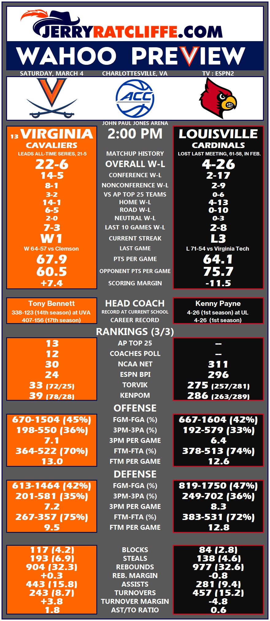 • UVA has a six-game win streak vs. Louisville, including a 61-58 win at Louisville this season and three-game sweep last season.