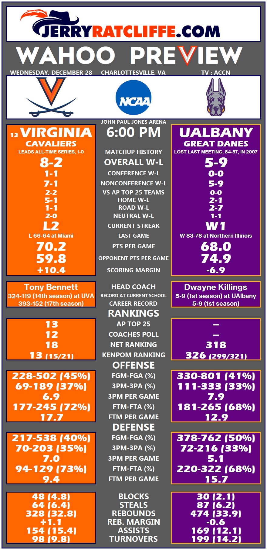 Virginia concludes its nonconference slate Wednesday night at 6 p.m. against UAlbany at John Paul Jones Arena. The 13th-ranked Cavaliers (8-2, 1-1 ACC) are looking to snap their first losing streak of the season, after a pair of tough losses to ranked, Quad-1 opponents (Houston, Miami).