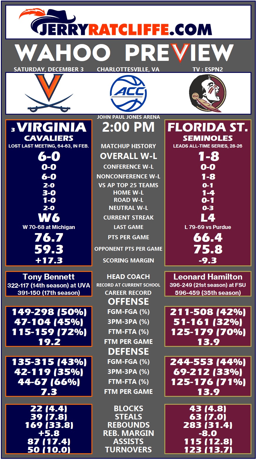 The Seminoles, who lead the all-time series, 28-26, have taken six of the last 10 meetings with the Cavaliers, including two of the last four in Charlottesville, and will be hungry to jumpstart ACC play with a bang.